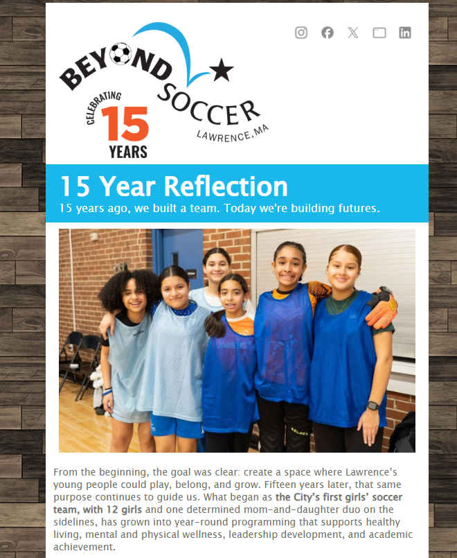 Beyond Soccer took center stage at the Good Sports Legends Gala, closing out the evening with a powerful video tribute that moved a packed room of 500+ business and sports industry leaders at Boston’s Intercontinental. Chosen by Good Sports for its year-round, soccer-based youth development work in Lawrence, Beyond Soccer is building brighter futures through a deep commitment to health, academics, leadership, and teamwork.