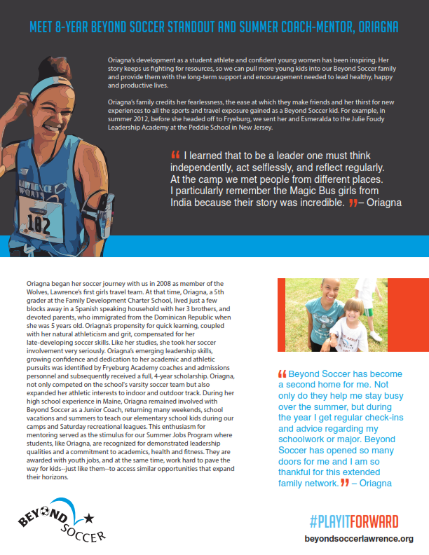 Oriagna Inirio, one of the original Wolves, began her journey with no sports background. Over the years, she returned every summer to coach younger players, while earning her degree from St. Anselm University. Today, she continues to inspire as Beyond Soccer’s first Communications Manager. Stories like Oriagna’s remind us why we keep fighting for resources and opportunities: so more kids in Lawrence can see — and seize — their own potential.
