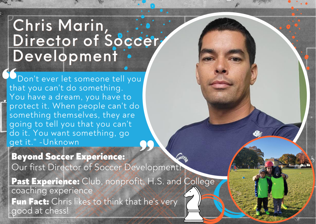 Chris Marin, our first Director of Soccer Development has always wanted to pay forward the opportunities he was given in life through soccer. Chris, the oldest of 9 brothers and sisters from El Paso, Texas, began playing soccer at age 5. His extensive coaching and youth development through sports experiences, including his experience as a Peabody Youth Soccer referee, a Salem YMCA after-school counselor, Varsity Assistant Coach at St. Mary’s in Lynn, Salem State College Goalkeeper Coach, North Shore United Soccer Club Coach, and Director of Coaches in Danvers, have prepared Chris to step up for Beyond Soccer and the Lawrence community. He credits soccer and those who pushed him to stick with it over the years as critical, constant positive influences in his life, always steering him in the right direction, which he is doing daily on fields and courts throughout the City. (See him pictured above last fall, dressed up for a special Halloween city league event. It is hard to pry Chris off of the fields and is always going the extra mile for kids!)