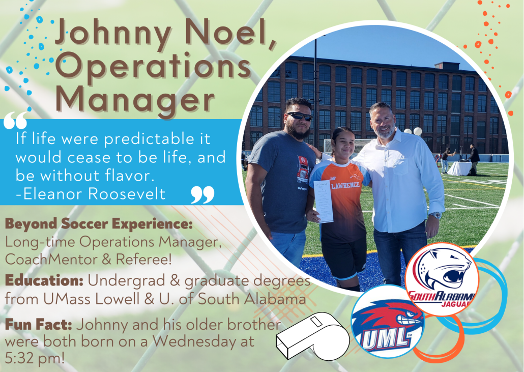 Johnny Noel handles the day-to-day functions, including bookkeeping, field, and equipment maintenance, human resource management, and CORI submissions. He is also looking forward to a more significant role overseeing and spearheading capital campaigns that could bring better, creative, multi-use playing spaces to the City, including use of the new Pavillion Field at Riverwalk (pictured here!). A UMass-Lowell graduate, Johnny also holds a master’s degree from the University of South Alabama. His competitive high school and college sports experiences advanced his passion for coaching, including jr hockey league participation. Johnny also answered a statewide referee shortage by becoming a certified High School and youth league referee 8 years ago. On Saturday mornings, after his regular check-ins and pep talks, you will find Johnny on a soccer field mentoring youth through his refereeing duties, which, by his example, is becoming a growing leadership pathway for our high school-aged players.