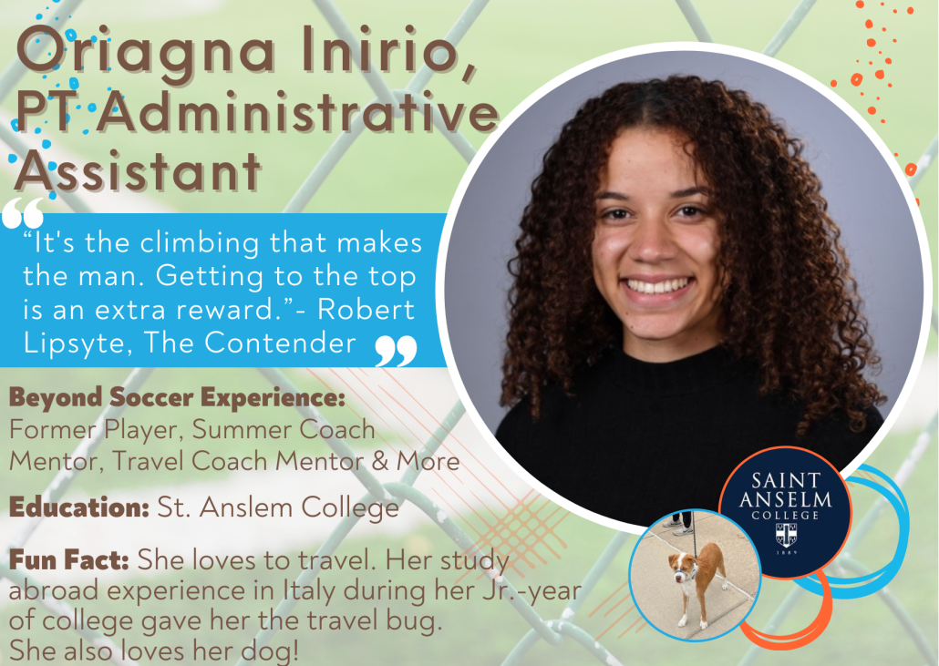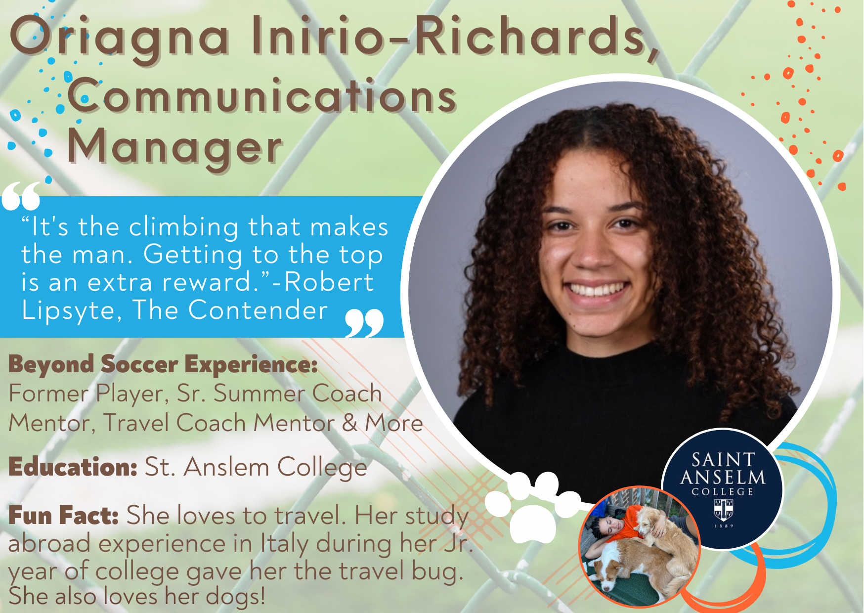 Oriagna, a 2020 Saint Anselm College graduate with a degree in Psychology, was on our first Bulldogs team in 2010, twelve (12) years ago! She also played club soccer for St. A’s! Fast forward to 2023, and she now lives outside of Detriot, Michigan where she works for us remotely as our PT Communications Manager, as well as in a new Administrative role in the health care field. This was after she continued to pass along her love for sports with Beyond Soccer in immeasurable ways. Oriagna become a constant fixture in our #LeadershipThroughSports efforts, joining us most summers for important behind-the-scenes planning and organizing as part of our first cohort of youth hires. She helped us bring our first camps to the City, like the Annual Sport & Wellness Academy that started in 2011. She has also contributed to other components of our year-round work, like developing BeyondFit & Balanced with a special emphasis on mental health. Oriagna also coached the Bradford Christian Academy Girls Varsity Soccer team for two seasons. We’re so proud of "Ori" and excited to see what her future holds and are thankful she still keeps us organized, from MI!