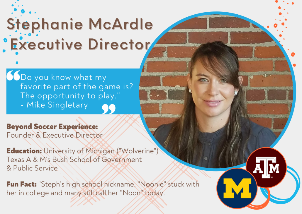 Stephanie began the programs that evolved into Beyond Soccer, growing it from its grassroots--12 girls on the first travel team--to a year-round, sports-based youth development organization, serving 2,000 kids. Steph, who captained the Michigan Women’s Soccer Team for 2 seasons, recognizes the power of sport to lift kids out of difficult situations. She’s a Massachusetts Youth Soccer Board Member and champions field development efforts that "level the playing field" for more kids. Recently, Stephanie decided to go back to school and pursue her Executive Master’s Degree in Public Service & Nonprofit Management at Texas A&M. Stephanie is also committed to advancing the Lawrence Sports Alliance, which is a group of likeminded sports leaders in Lawrence who want to make sports more equitable. When she is not working or studying, she loves spending time with her rescue pups, Ace and Dega, plus her families 6 other rescue dogs!