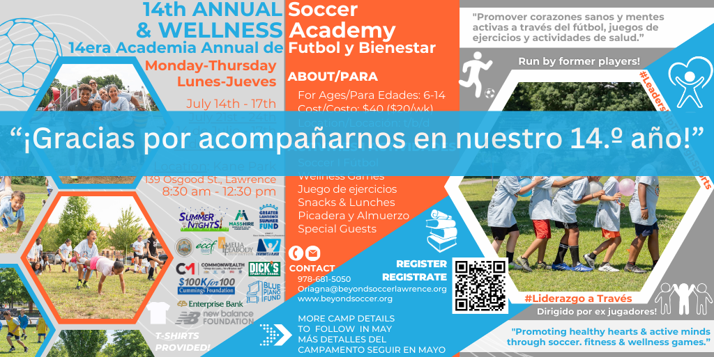 El 14.º año de nuestra Academia de Fútbol y Bienestar fue un gran éxito, con la participación de casi 150 niños y jóvenes de primaria y secundaria durante dos semanas de fútbol, juegos de acondicionamiento físico y actividades especiales con la Policía y Bomberos de Lawrence, además de Stories in the Street.