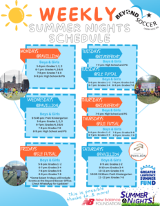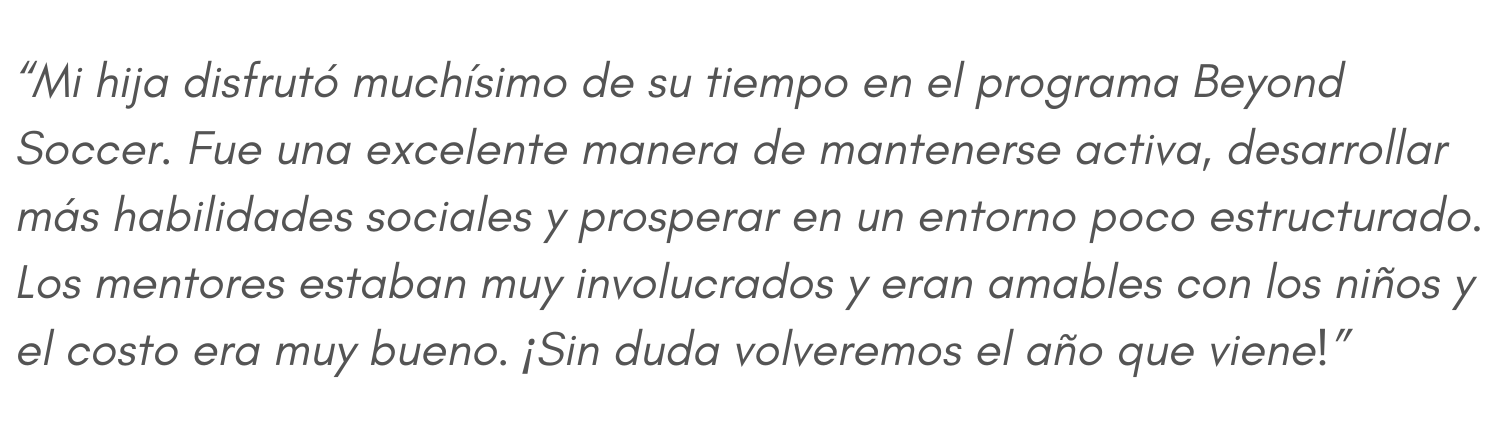 Además de Summer Nights y nuestra Academia Anual de Fútbol y Bienestar, Beyond Soccer ha dirigido o patrocinado los siguientes programas de verano para asegurar que nuestros niños tengan oportunidades consistentes de participación y actividades saludables: