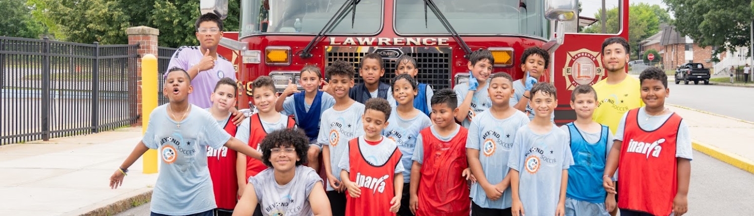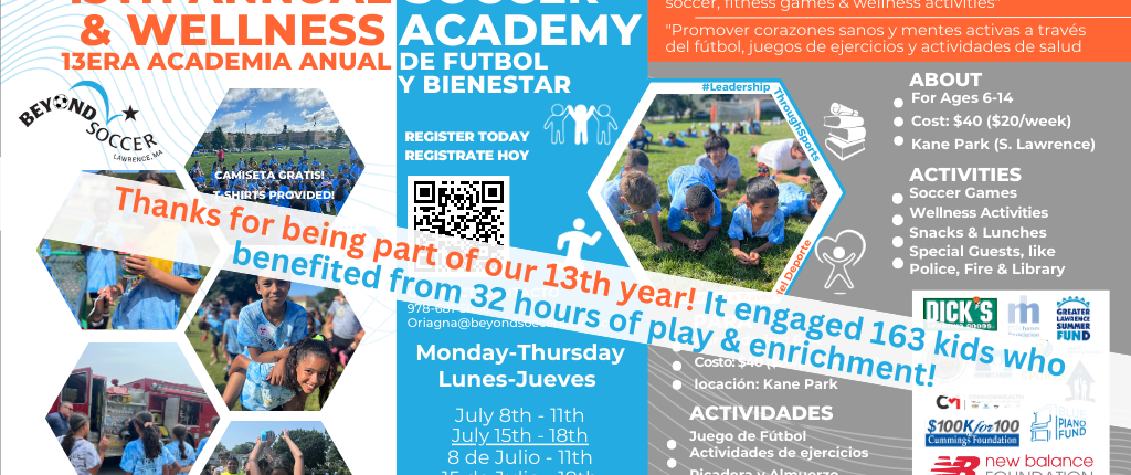 El 14.º año de nuestra Academia de Fútbol y Bienestar fue un gran éxito, con la participación de casi 150 niños y jóvenes de primaria y secundaria durante dos semanas de fútbol, juegos de acondicionamiento físico y actividades especiales con la Policía y Bomberos de Lawrence, además de Stories in the Street.