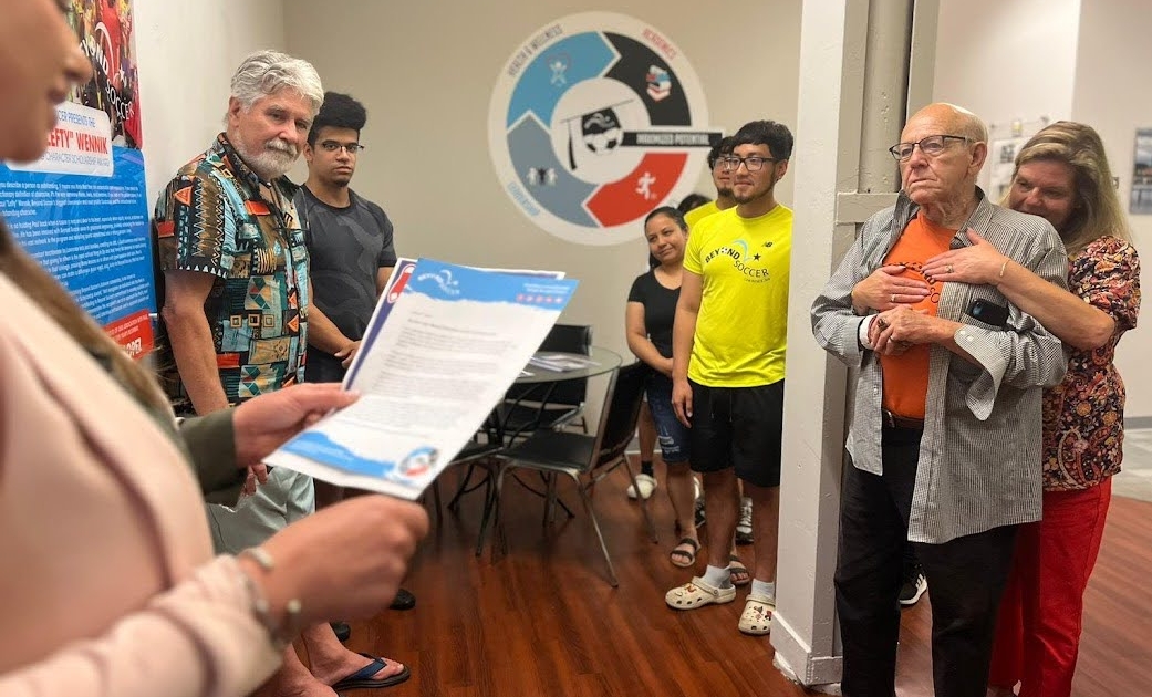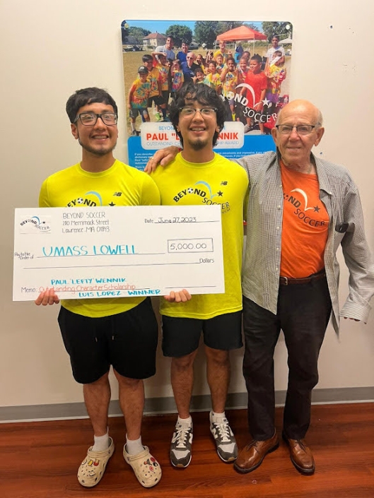 On June 27th, Executive Director Stephanie and the Board of Directors, led by new Board President Nina Leach, raised initial funding to provide Luiz Lopez with the first-ever Paul Wennik Outstanding Character Scholarship. This award (more below) means that Luiz, pictured with his family, including his twin brother Angel, received a $5,000 scholarship to support college tuition costs to attend UMass Lowell this fall. In Luiz’s case, it is fulfilling a much-needed tuition gap that the family was trying to meet and again came as a total surprise to both Luiz and Paul. Hopefully, you can tell from the photos!